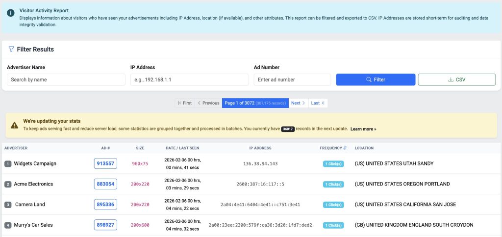 Gain deep transparency into your traffic with AdPeeps’ native real-time visitor log. This powerful tool provides a live window into your ad delivery, allowing you to monitor exactly who is interacting with your campaigns as it happens. By tracking key data points like IP addresses and geographic locations, you can gain valuable insights into your audience demographics and browsing behaviors.