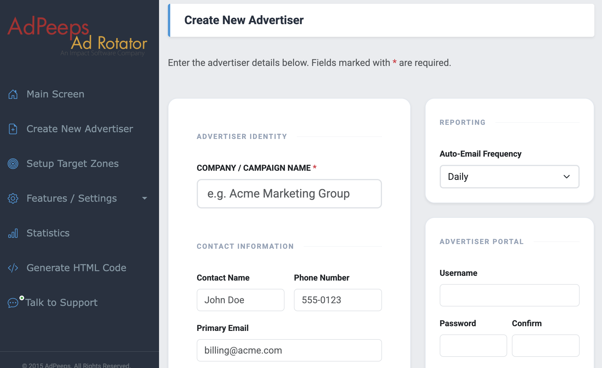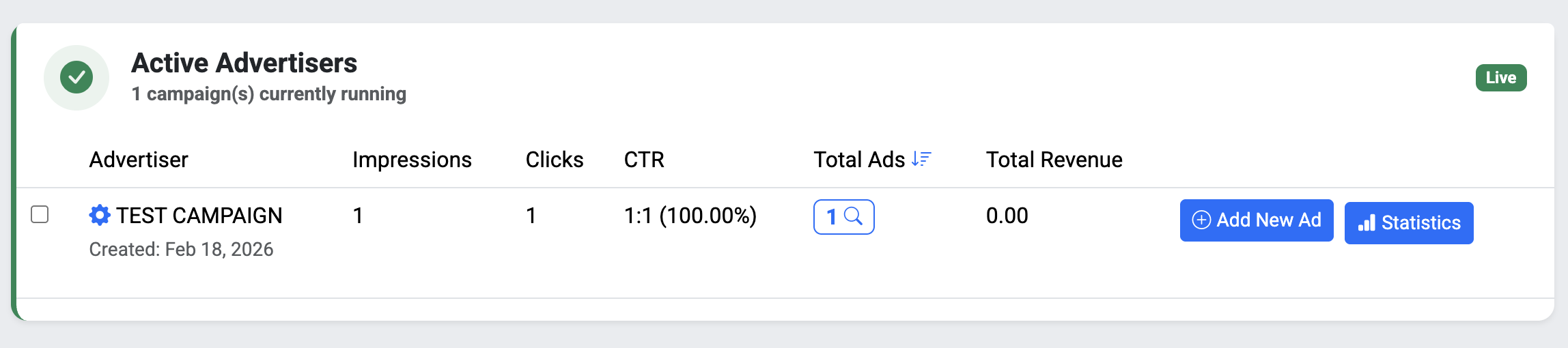 Creating your first campaign is quick and straightforward! From the left-hand navigation menu, simply click the Create New Advertiser button to get started. You’ll be taken to a setup screen where you can configure your campaign — and don’t worry, the only thing you need to fill in is the campaign or advertiser name. Everything else is optional!
