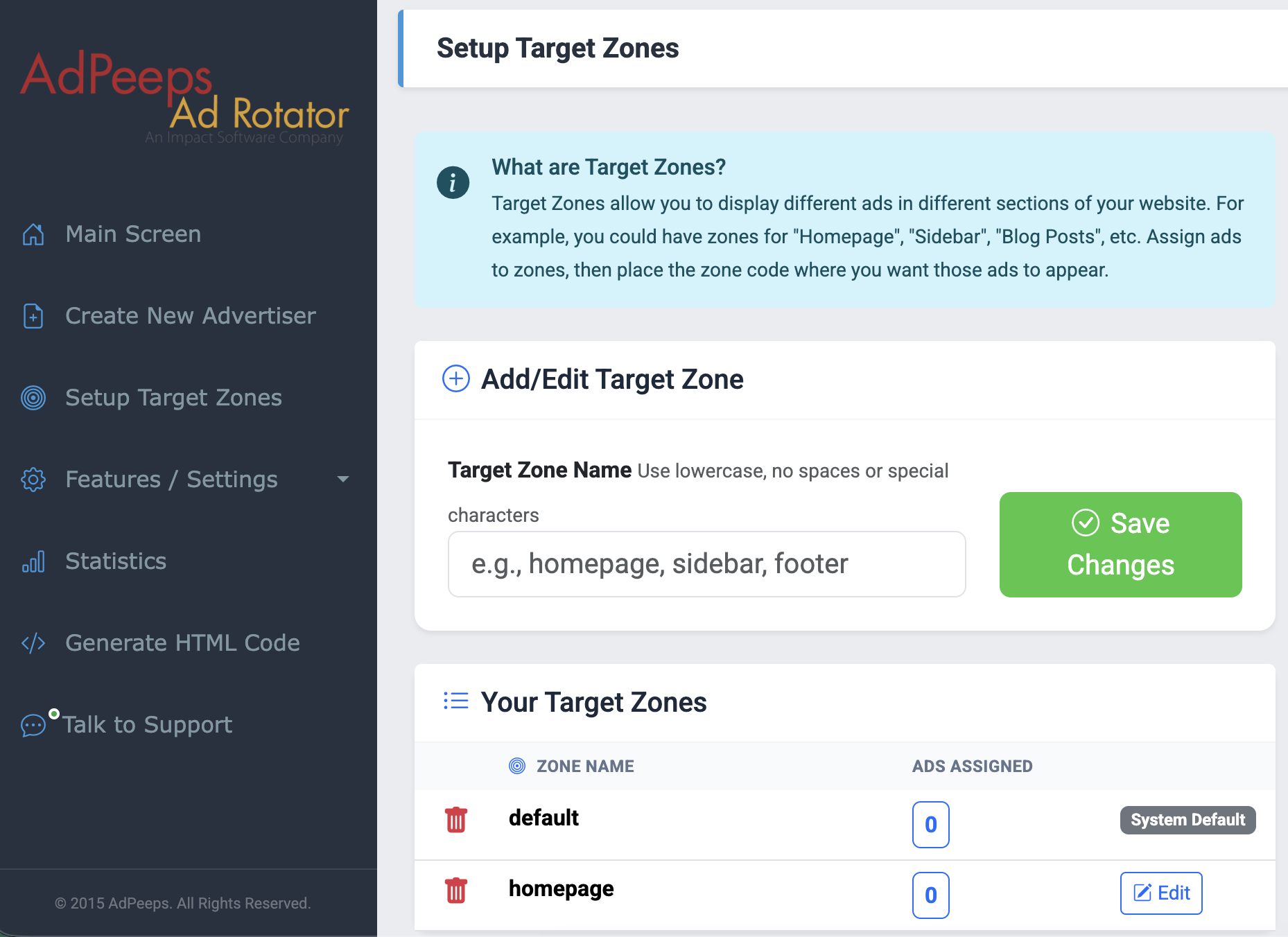Target Zones are a powerful way to control where specific ads appear on your website. Think of each zone as a designated ad placement — for example, you might create zones for your Homepage, Sidebar, or Blog Posts. Once your zones are set up, you simply assign ads to the appropriate zone and place the generated zone code wherever you want those ads to display on your site.