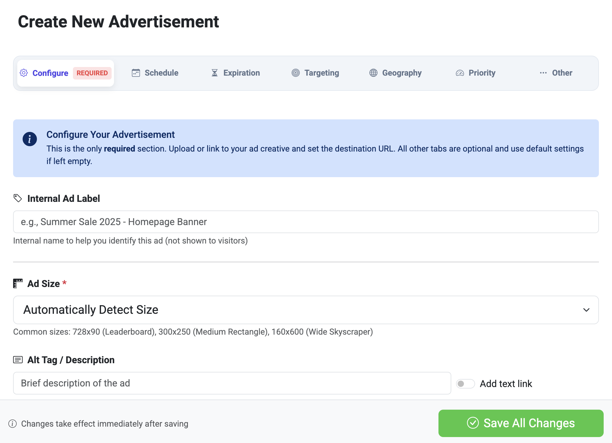 If you’re uploading an ad file, the system will automatically detect the size for you. If you’re linking to a remote ad, simply select the size from the dropdown menu. Creating a text ad? Select Text Ad from the dropdown and the screen will refresh to show you the relevant fields.