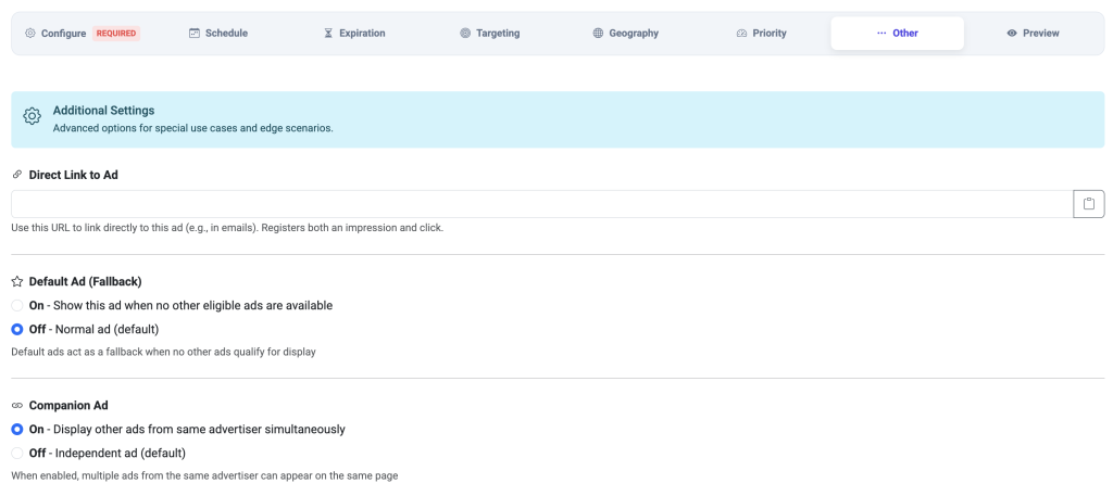 When Companion Ads are enabled, AdPeeps groups eligible ads and serves them together to the same visitor.